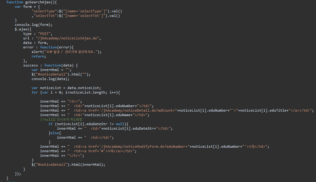 검색을 위한 데이터를 Ajax로 처리하기 위한 코드이다.