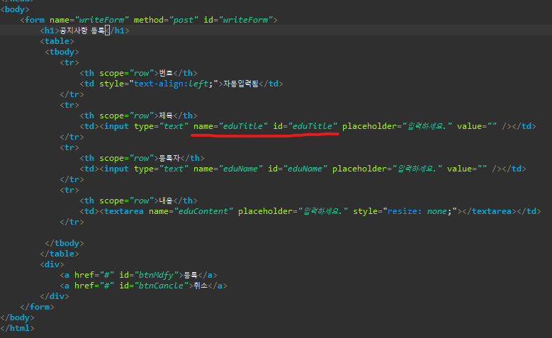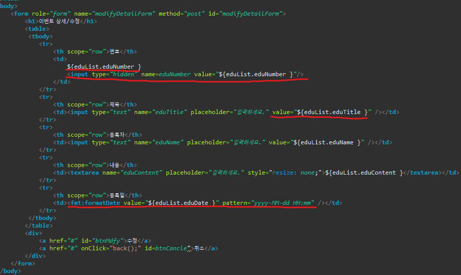 수정을 위한 폼이기 때문에 value 부분에 상세화면에서 뿌렸던(?)것과 같은 값을 가지고 있는 데이터를 노출시켜준다.