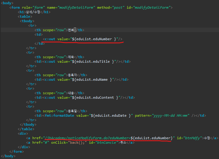 ${eduList.eduNumber }은 view에서 번호값은 보이지만 그 밑에
